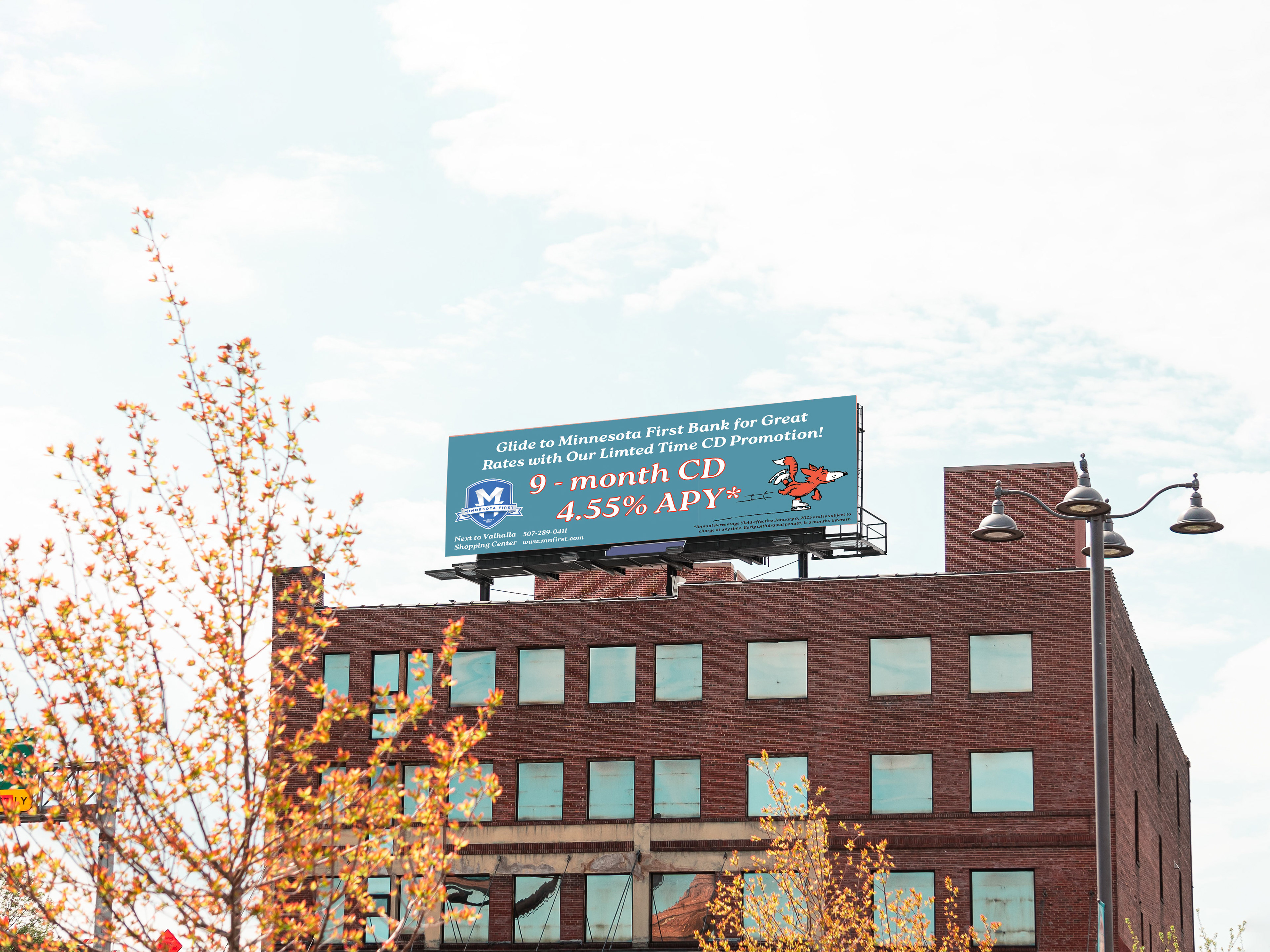 I partner with Minnesota First Bank and work with their marketing leader to provide graphics for print and digital advertisements. I am provided only with the current deal or promotion and I am responsible for curating the concept and developing a design for approval. I mainly create postcards for existing customers and digital billboards to attract new clients. While working with Minnesota First my advertisements have collectively brought in over $700,000 in Certificates of Deposits.